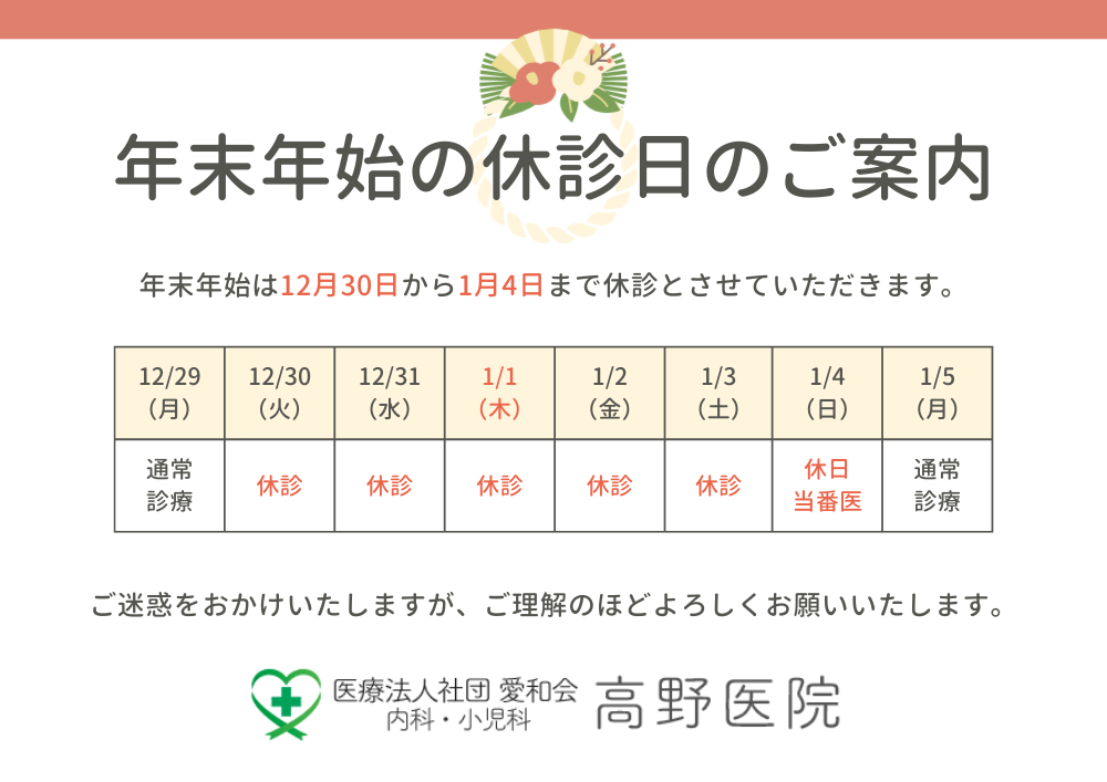 お休みの前後は混雑が予想されますので早めの受診をお願いします。