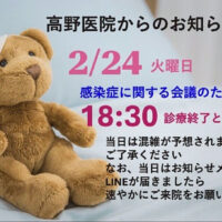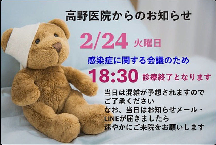 2月24日は感染症に関する会議のため、18:30には診療を終了させていただきます。