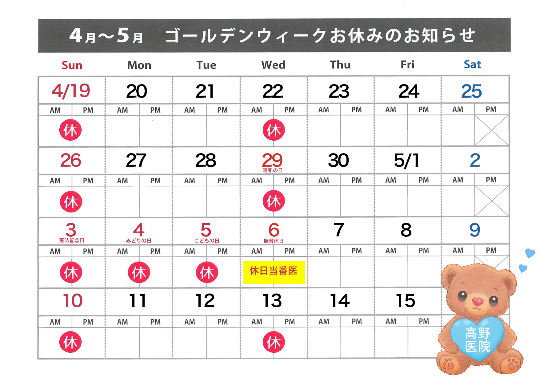 5月6日(水)は、休日当番医(9時〜5時)です。